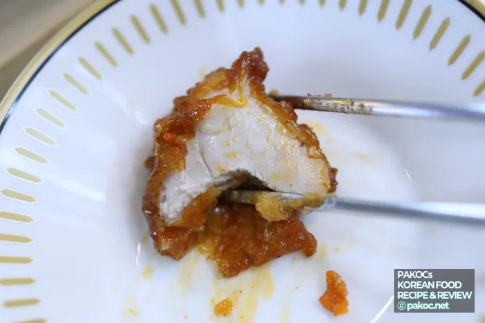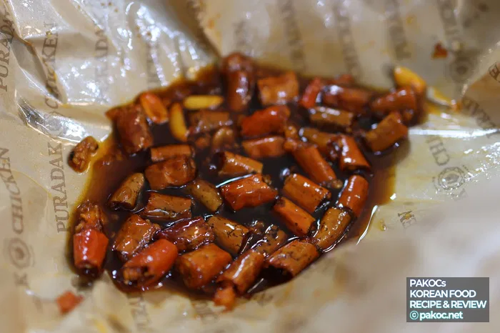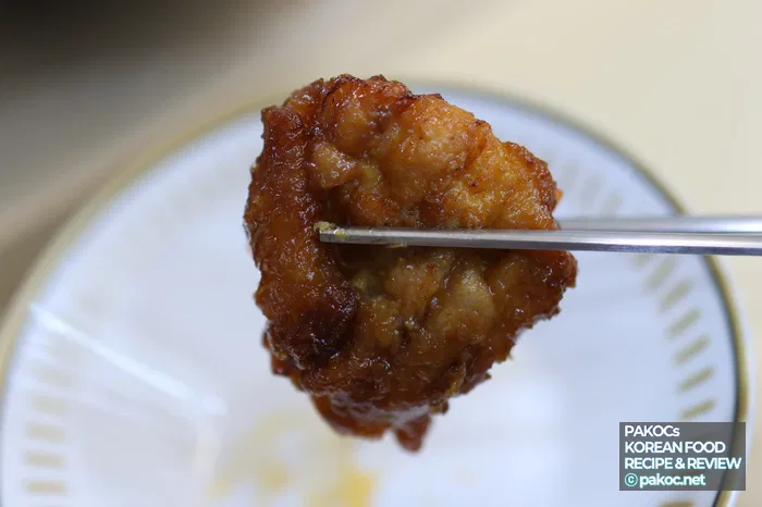Copyright PAKOC https://pakoc.netSince ‘Puradak’ boneless itself is oven-fried and uses chicken thigh meat, it’s a bit greasy, so it pairs very well with the sauce! It’s close to a grilled feel, so it’s chewy, giving a different texture from fried Kanpunggi. The sauce is a bit thick, so the chicken doesn’t get soggy easily, which is another advantage that shines here!